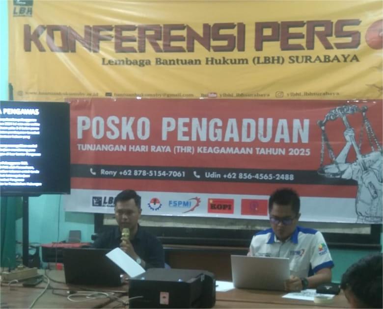 SR, Surabaya – Beberapa elemen masyarakat yang terdiri atas lembaga bantuan hukum, serikat pekerja dan organisasi kepemudaan bersepakat mendirikan Posko Tunjangan Hari Raya (THR) Keagamaan Tahun 2025. Posko ini siap menerima aduan dan memberi bantuan advokasi bagi pekerja yang terlanggar haknya. Pembukaan Posko THR dirilis di Kantor LBH Surabaya Jl. Kidal No. 6 Surabaya, Selasa (4/3/2025).