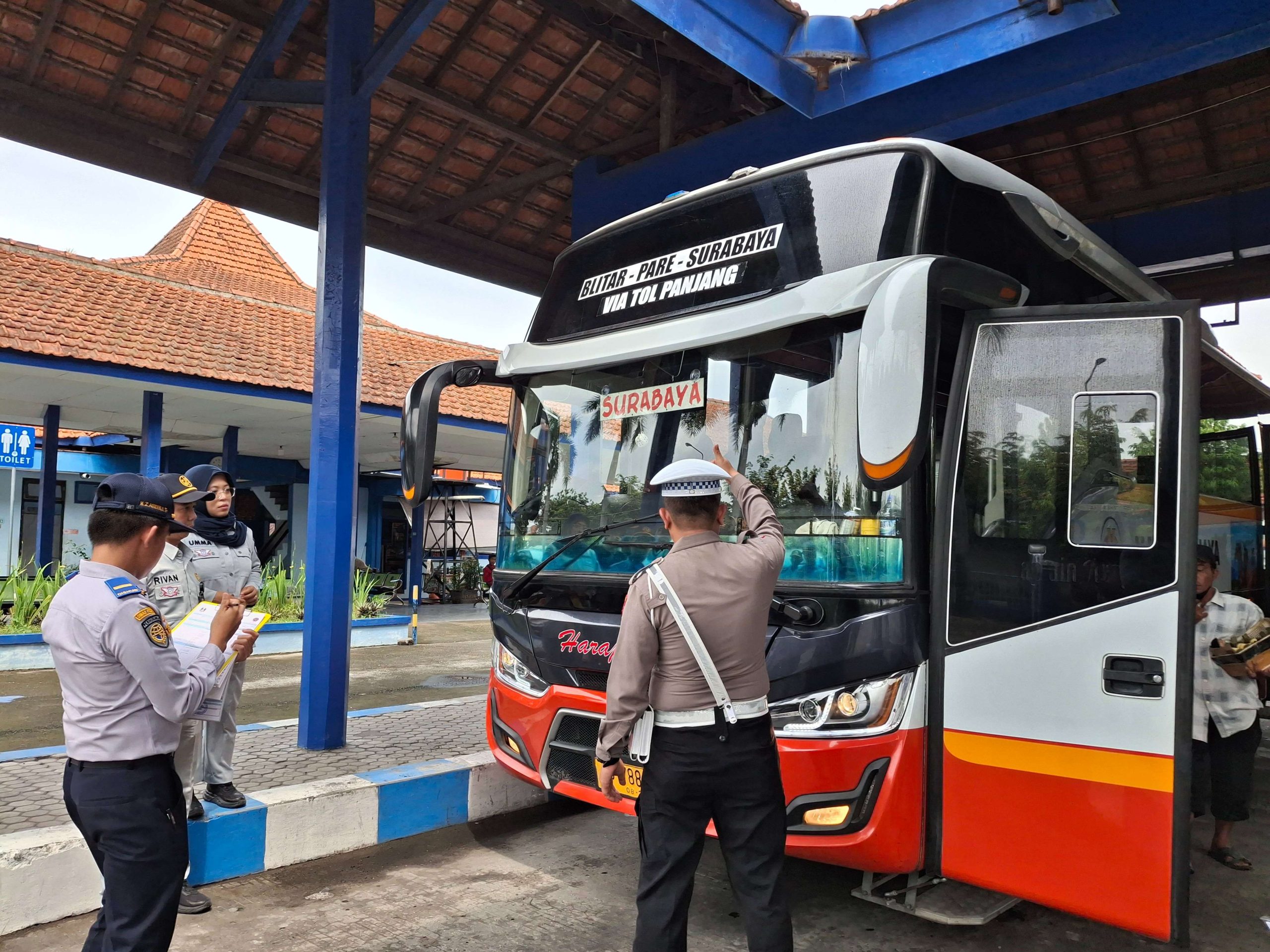 SR, Kediri – Untuk mengamankan suasana Natal dan Tahun Baru 2024/2025, Tim Gabungan melakukan rampcheck (pemeriksaan rem) di Terminal Bus Pare, Kabupaten Kediri, pada Kamis (12/12/2024)