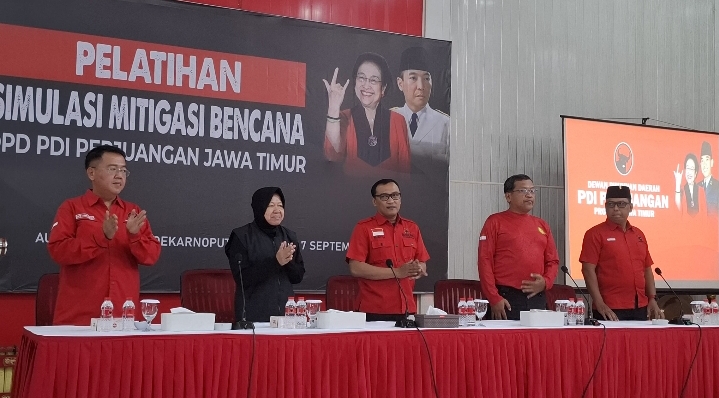SR, Surabaya – DPD PDI Perjuangan Jawa Timur menggelar pelatihan Simulasi Mitigasi Bencana, di lantai 2 Aula Megawati kantor DPD, Minggu (7/9/2025).