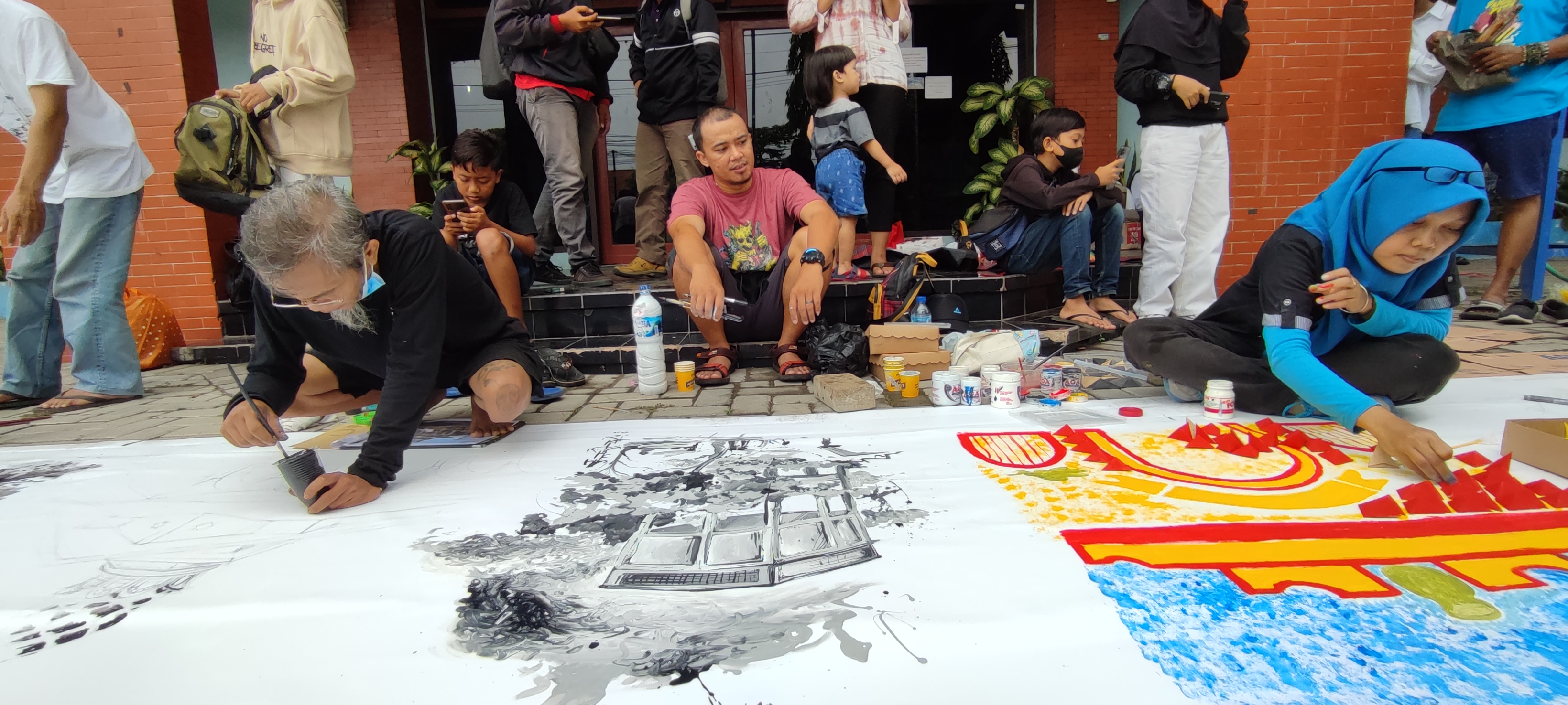 SR, Kediri – Belasan seniman yang tergabung dalam Komunitas Rupa Kita menggelar kegiatan melukis di halaman luar Perpustakaan Umum Kota Kediri di Jalan Diponegoro, Balowerti, Pocanan, Kecamatan Kota, Kota Kediri.