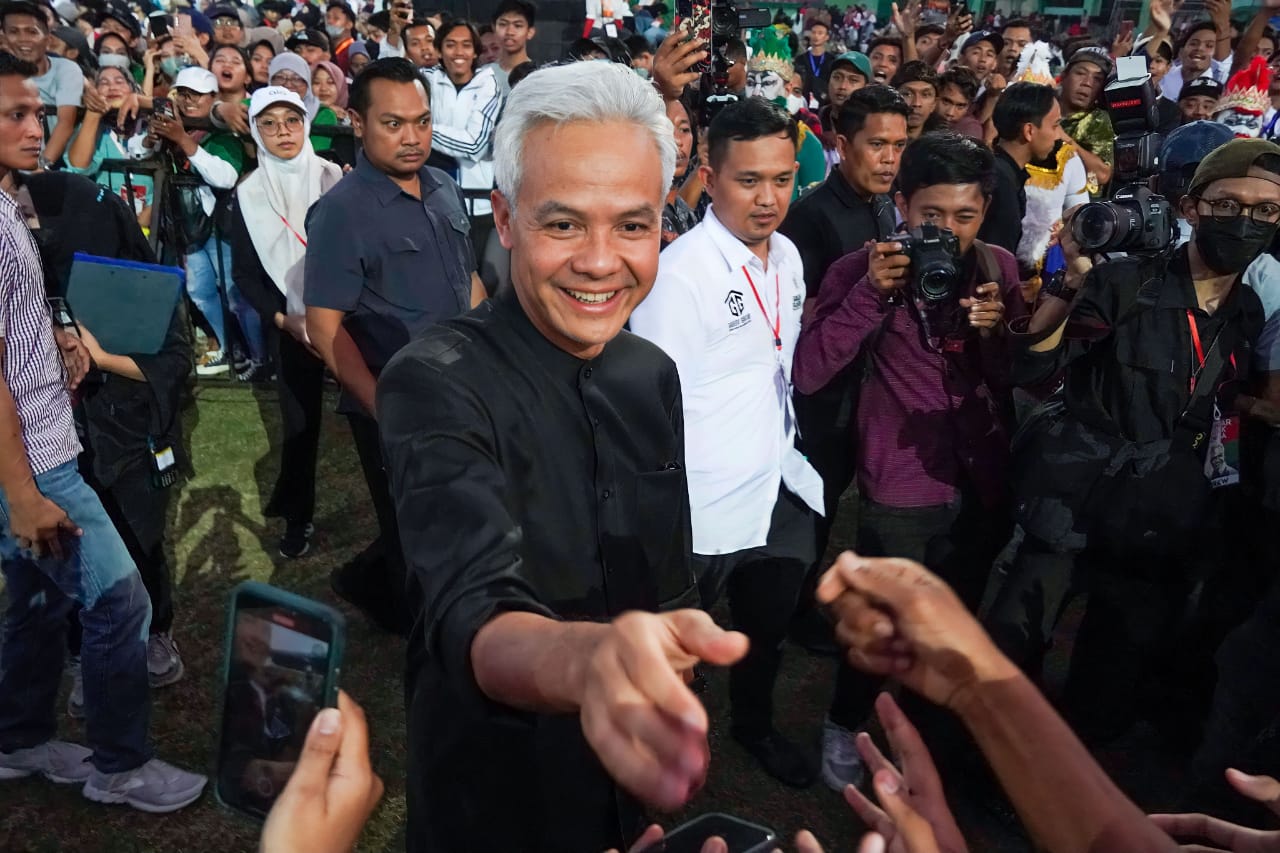 SR, Sidoarjo – Bakal calon presiden Ganjar Pranowo menyapa puluhan ribu relawan dari berbagai daerah dalam gelaran “Merawat Jiwa Nusantara Silaturahmi Relawan Ganjar” di Gelora Delta Sidoarjo, Sabtu (10/6/2023).