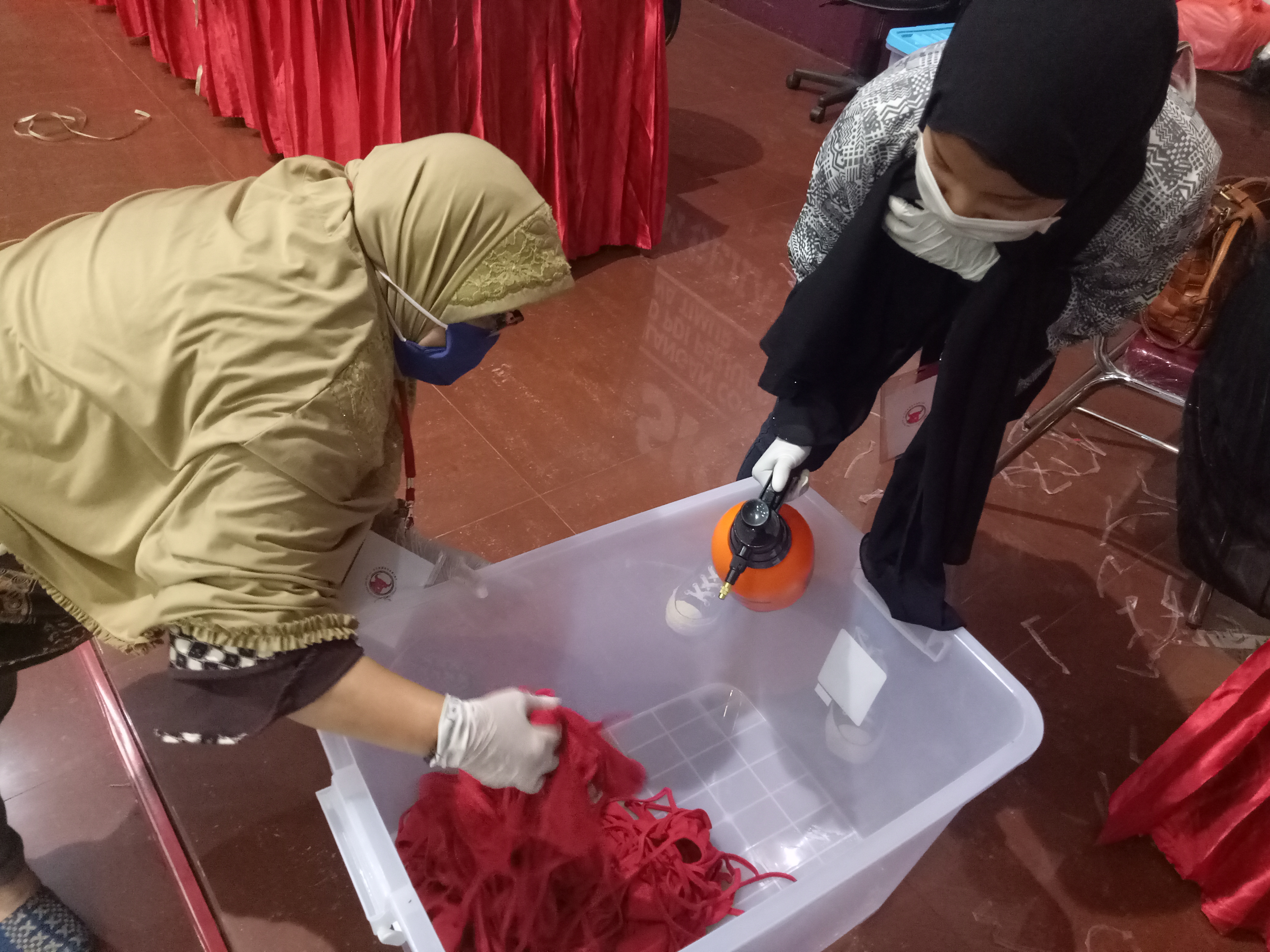 Guna menjaga kebersihan masker yang diproduksi, mereka juga melibatkan pihak medis dalam pengawasannya, termasuk menerapkan protokol cegah Corona di area kantor DPD PDI Perjuangan Jatim dengan memasang bilik semprot disinfektan sebelum memasuki pintu utama gedung.