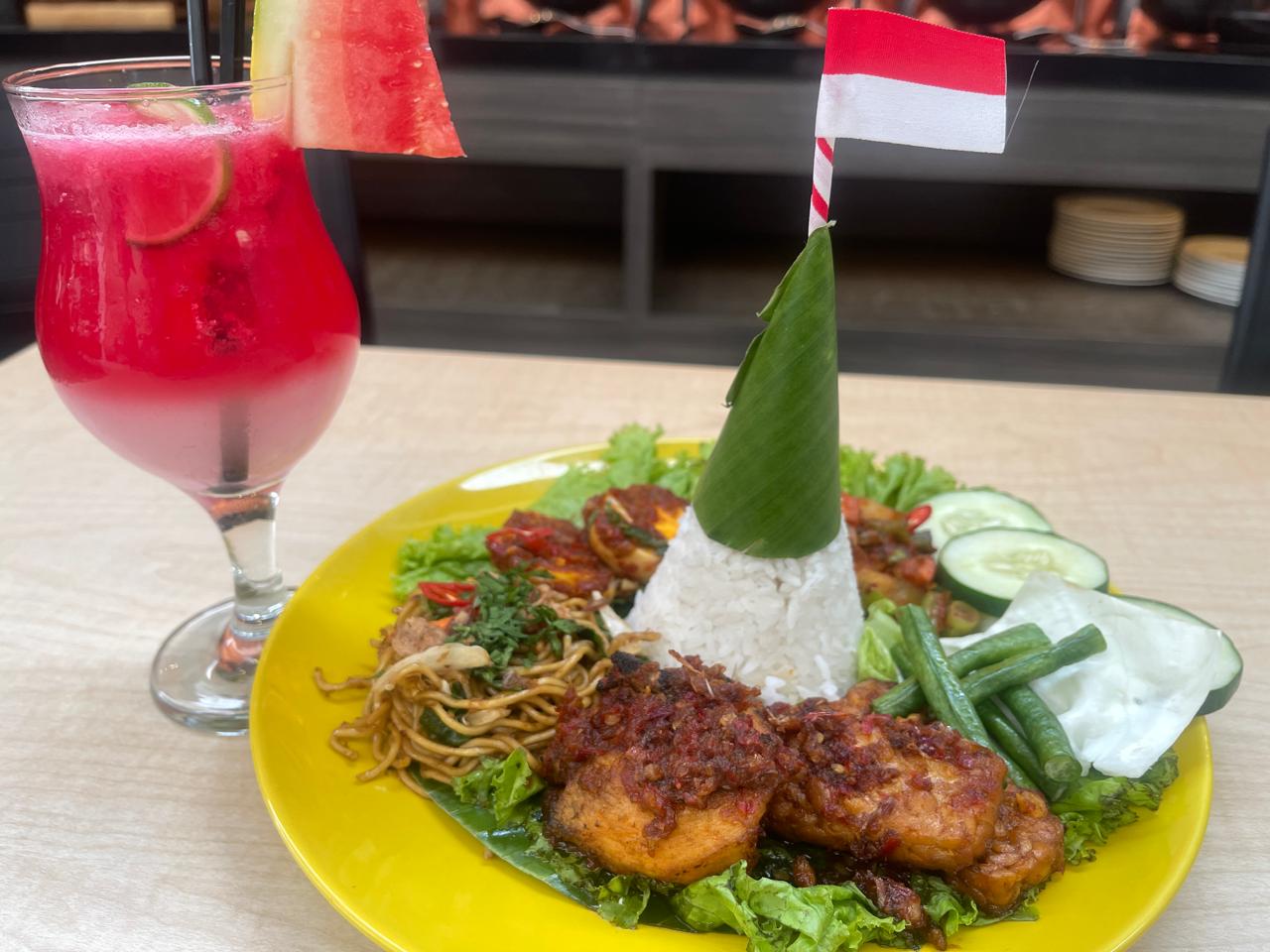 Selama periode 1 – 31 Agustus 2025, para tamu dapat menikmati Nasi Campur Merdeka hanya dengan harga Rp 35.000 net per porsi, serta Jus Merah Putih seharga Rp 20.000 net per gelas.