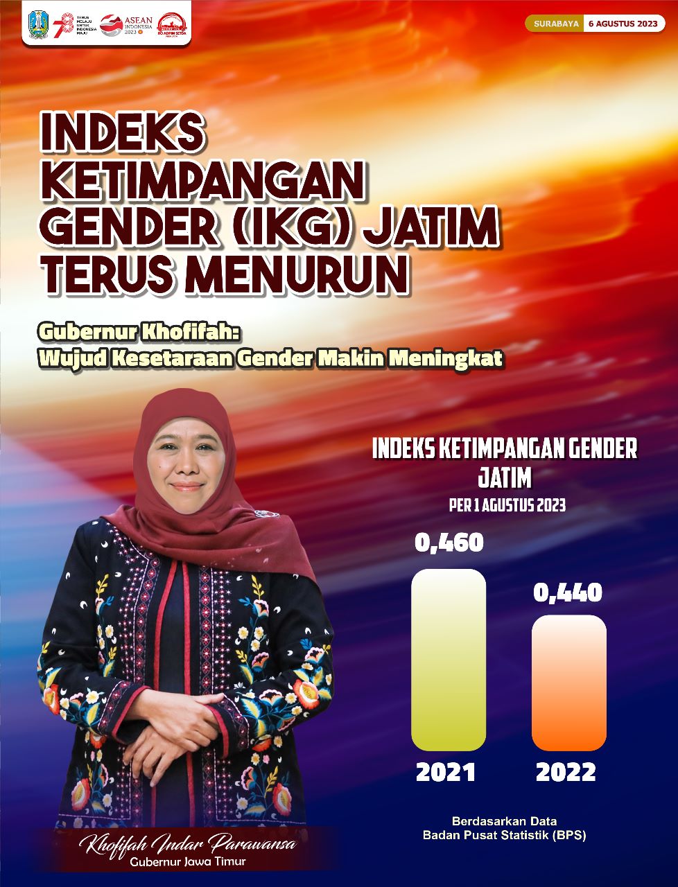 SR, Surabaya – Indeks Ketimpangan Gender (IKG) di Jawa Timur mengalami penurunan signifikan dibandingkan tahun sebelumnya. Berdasarkan data Badan Pusat Statistik (BPS) Jatim yang dirilis 1 Agustus 2023, tahun 2022 nilai IKG Jatim 0,440 turun signifikan dibanding tahun 2021 di angka 0,460, atau menurun 0,020 poin.