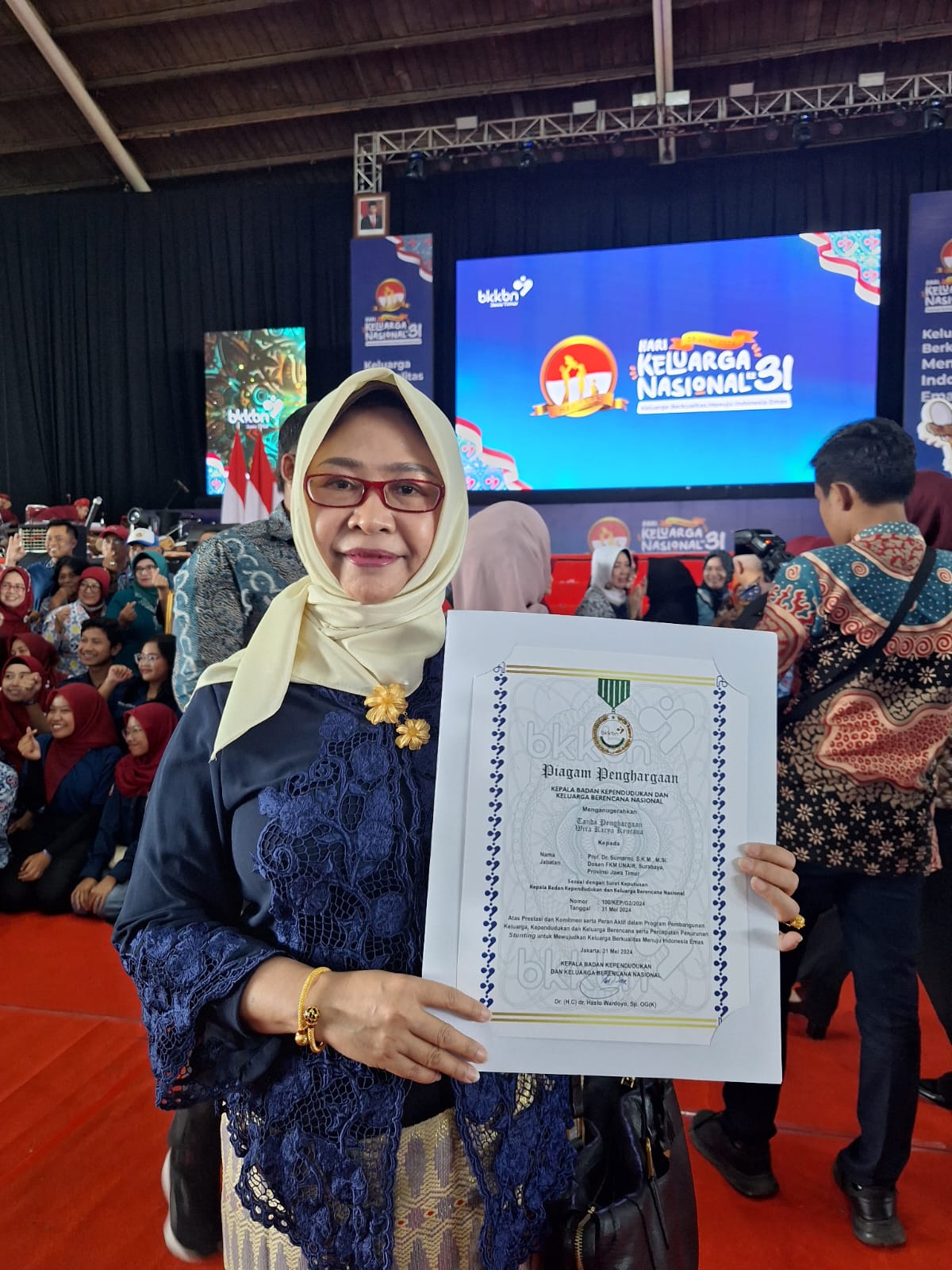 SR, Surabaya – Guru besar Fakultas Kesehatan Masyarakat (FKM) Universitas Airlangga (UNAIR) Prof Dr Sri Sumarmi SKM MSi menerima penghargaan dalam bidang Pembangunan Keluarga, Kependudukan, dan Keluarga Berencana (Bangga Kencana) dari Badan Kependudukan dan Keluarga Berencana Nasional (BKKBN).