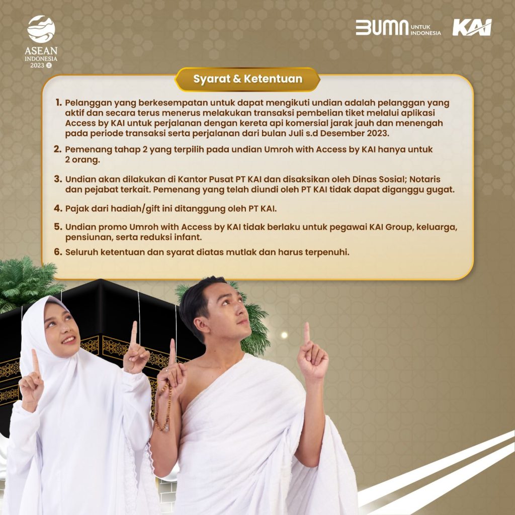 “Program undian Umroh tahap kedua di tahun 2023 ini KAI selenggarakan sebagai wujud apresiasi kepada pelanggan setia KAI khususnya member Access by KAI,” ujar Manager Humas KAI Daop 8 Surabaya, Luqman Arif.