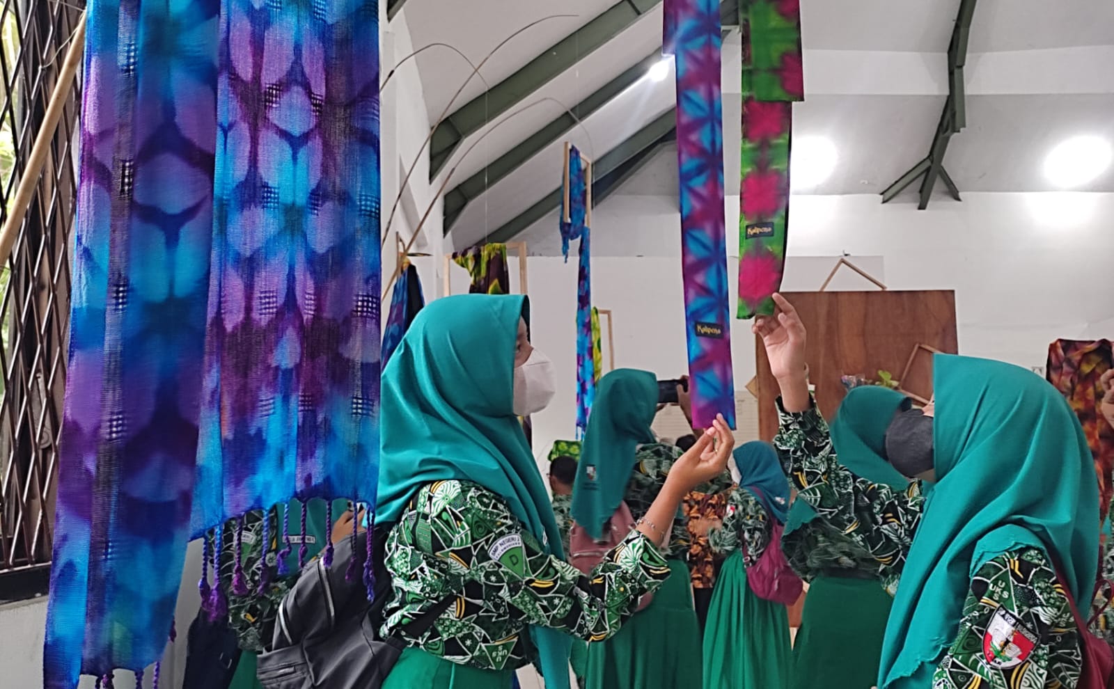 SR, Sidoarjo – Beragam corak warna dan motif kain batik shibori hasil karya pelajar SMP Negeri 2 Balongbendo Sidoarjo dipamerkan di Museum Mpu Tantular Sidoarjo, Kamis (1/12/2022).