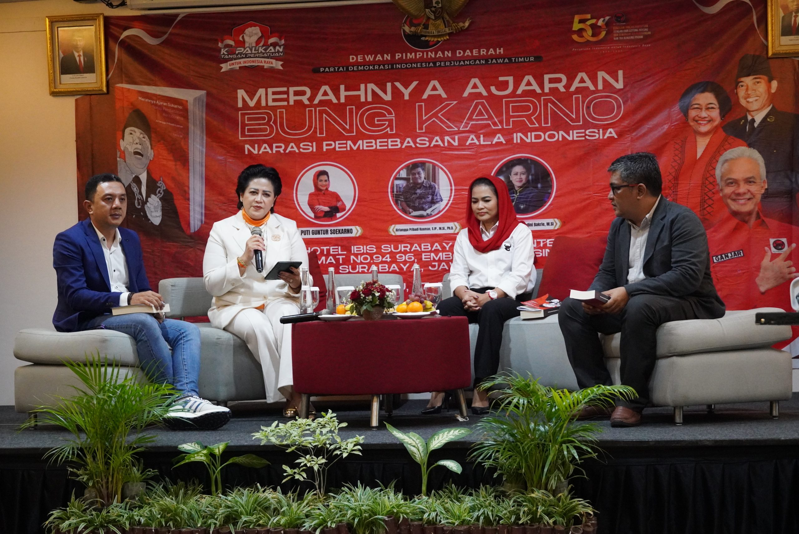 “Mengapa judulnya Merahnya Ajaran Bung Karno, karena dari situ kita bisa lihat semua latarbelakang pemikiran besar Presiden Sukarno, bagaimana kekuatan pemikirannya melahirkan bangsa ini,” ujarnya dalam acara diskusi dan bedah buku “Merahnya Ajaran Sukarno: Narasi Pembebasan Ala Indonesia” di Surabaya, Sabtu (17/6/2023).