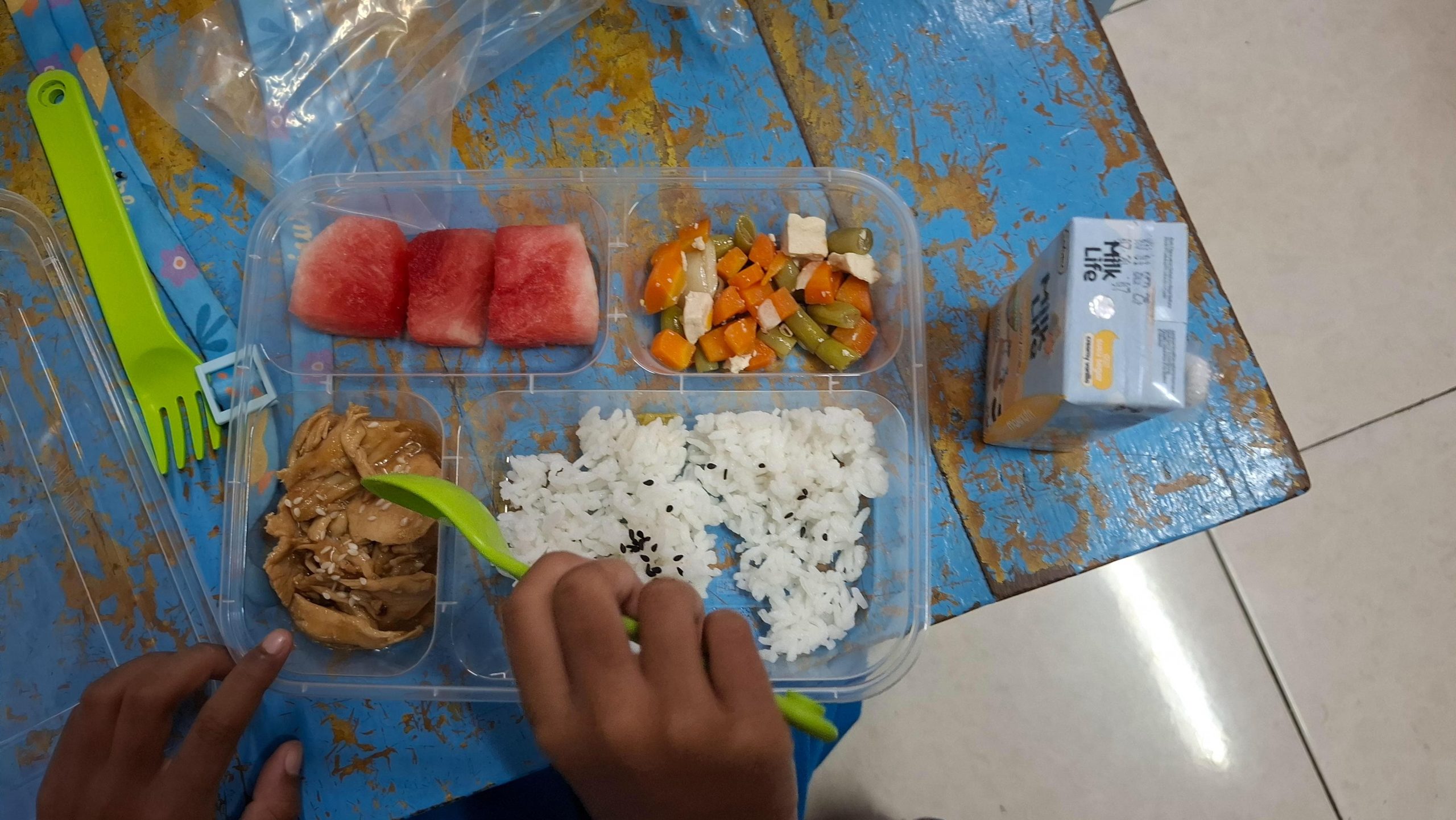Menu yang disajikan juga sudah pas, hanya saja sayur dirasa kurang lunak sehingga anak kesulitan. “Anak kalau makan ayam itu susah nguyahnya,” sebutnya.