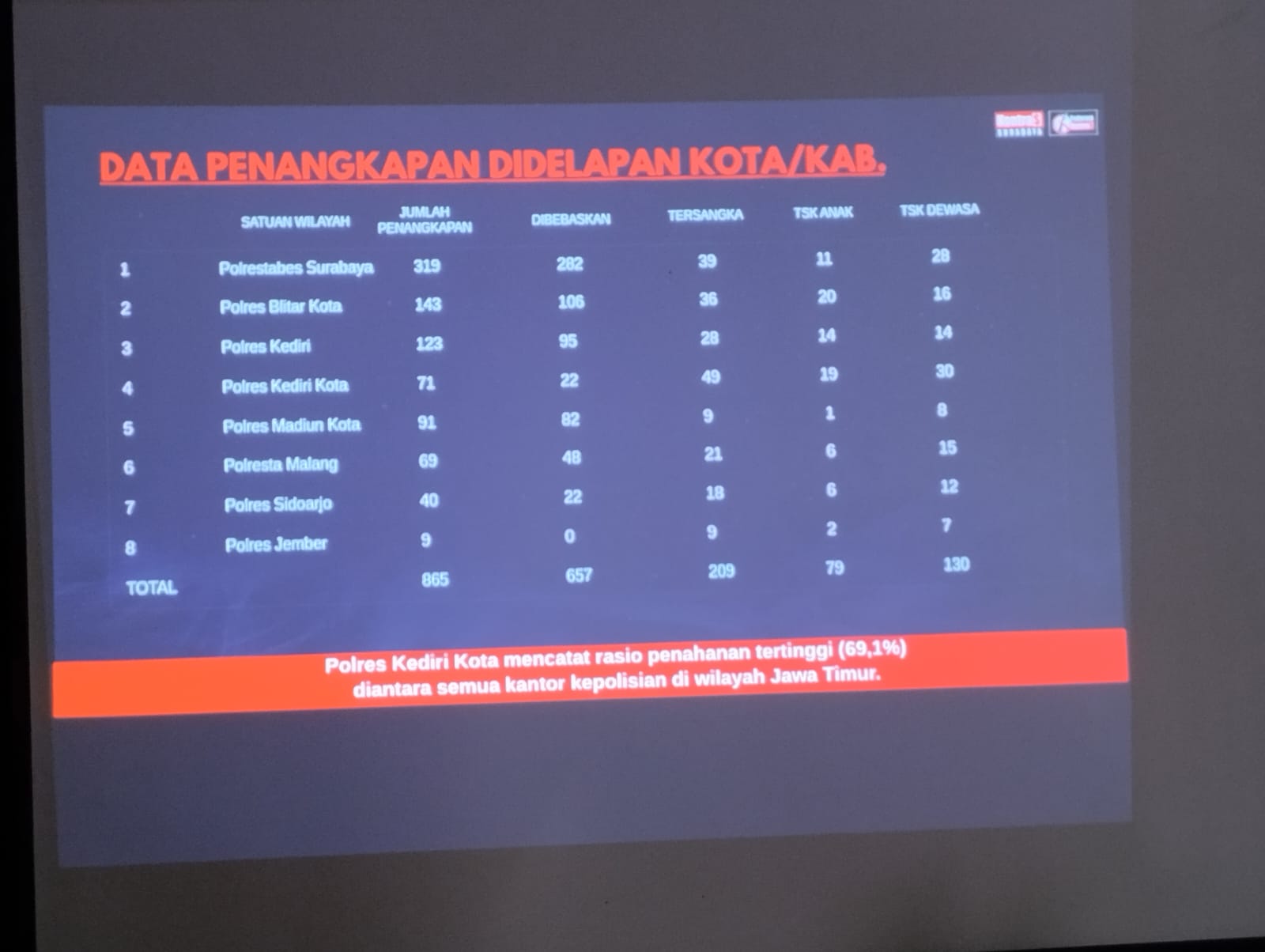 Penangkapan itu sendiri tersebar di delapan daerah di Jawa Timur, meliputi Polrestabes Surabaya, Polres Blitar Kota, Polres Kediri, Polres Kediri Kota, Polres Madiun Kota, Polresta Malang, Polres Sidoarjo, dan Polres Jember.