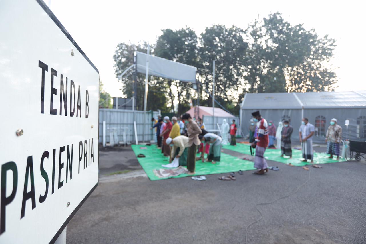 SR, Surabaya – Rumah Sakit Lapangan Indrapura Surabaya (RSLI) menyelenggarakan Salat Idulfitri 1442 H bersama pasien Covid-19, Kamis (13/5/2021).