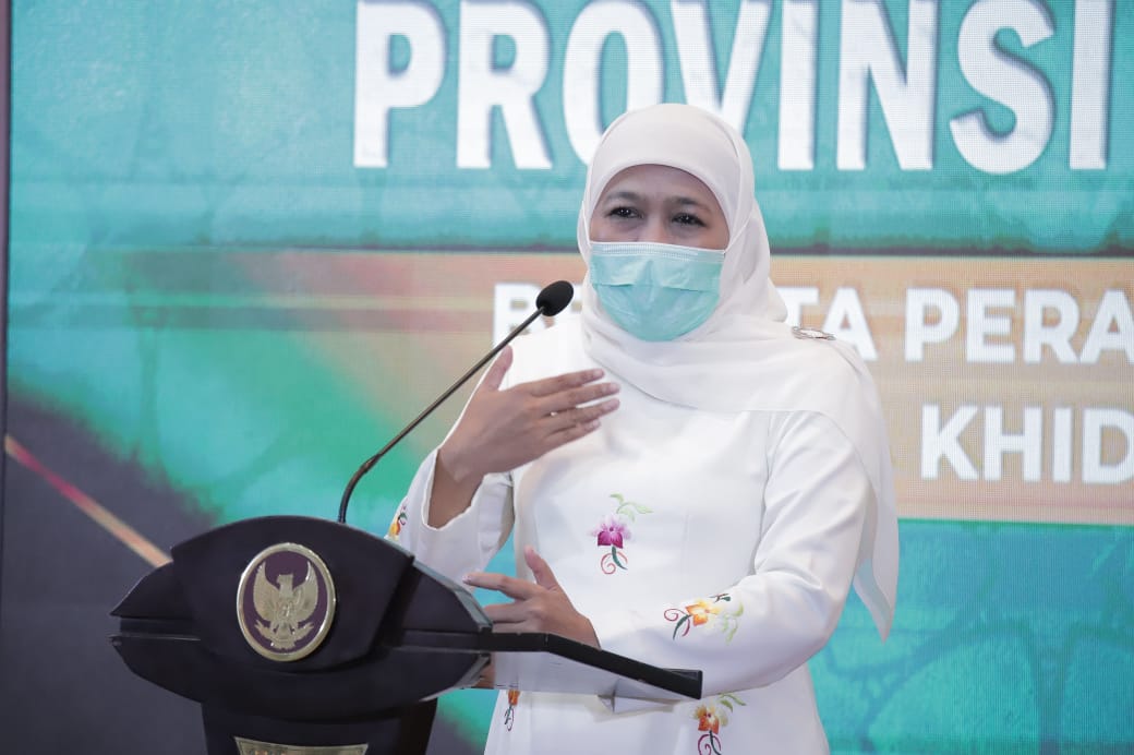 SR, Surabaya – Gubernur Jawa Timur, Khofifah Indar Parawansa menghadiri Pengukuhan dan Ta’aruf Dewan Pimpinan Majelis Ulama Indonesia (MUI) Jawa Timur beserta Perangkat Organisasi Masa Khidmat 2020-2025 di Gedung Negara Grahadi Surabaya, Senin (16/2/2021) malam.