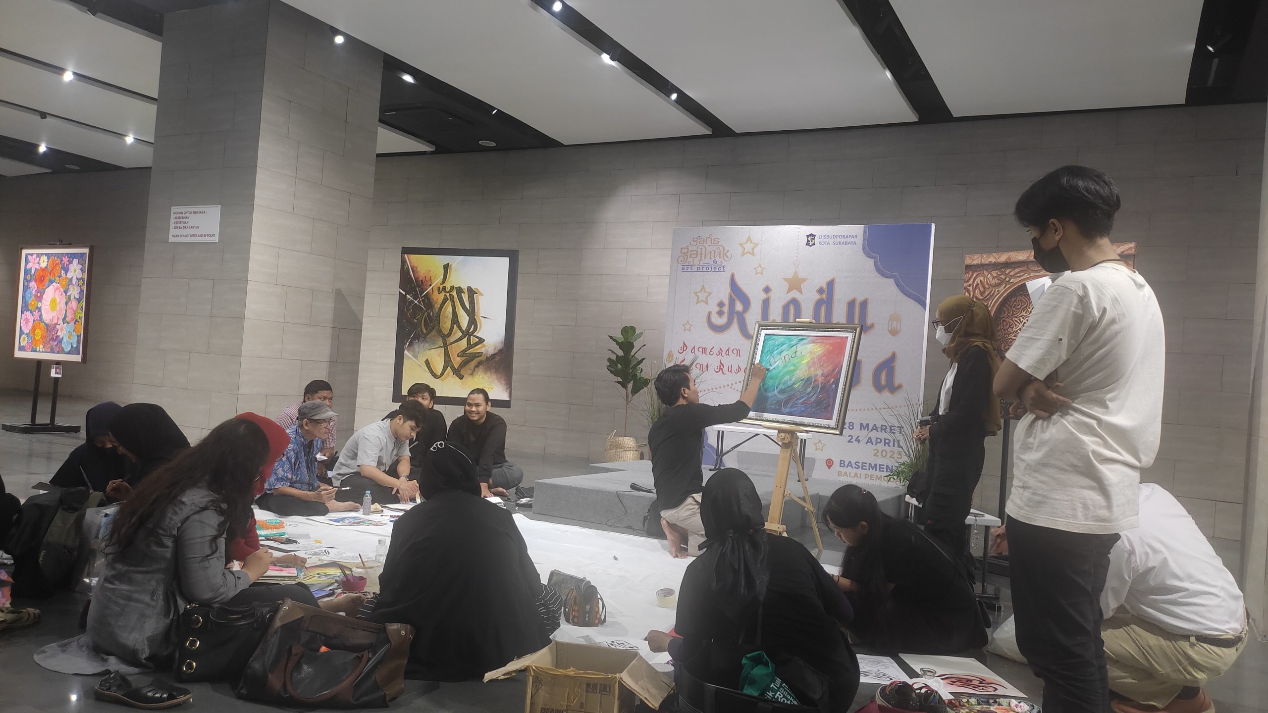 SR, Surabaya – Puluhan masyarakat dari berbagai kalangan dan usia mengisi waktu jelang berbuka puasa dengan melukis kaligrafi bersama di Basement Balai Pemuda, Alun-alun Kota Surabaya, Rabu (5/4/2023) sore.