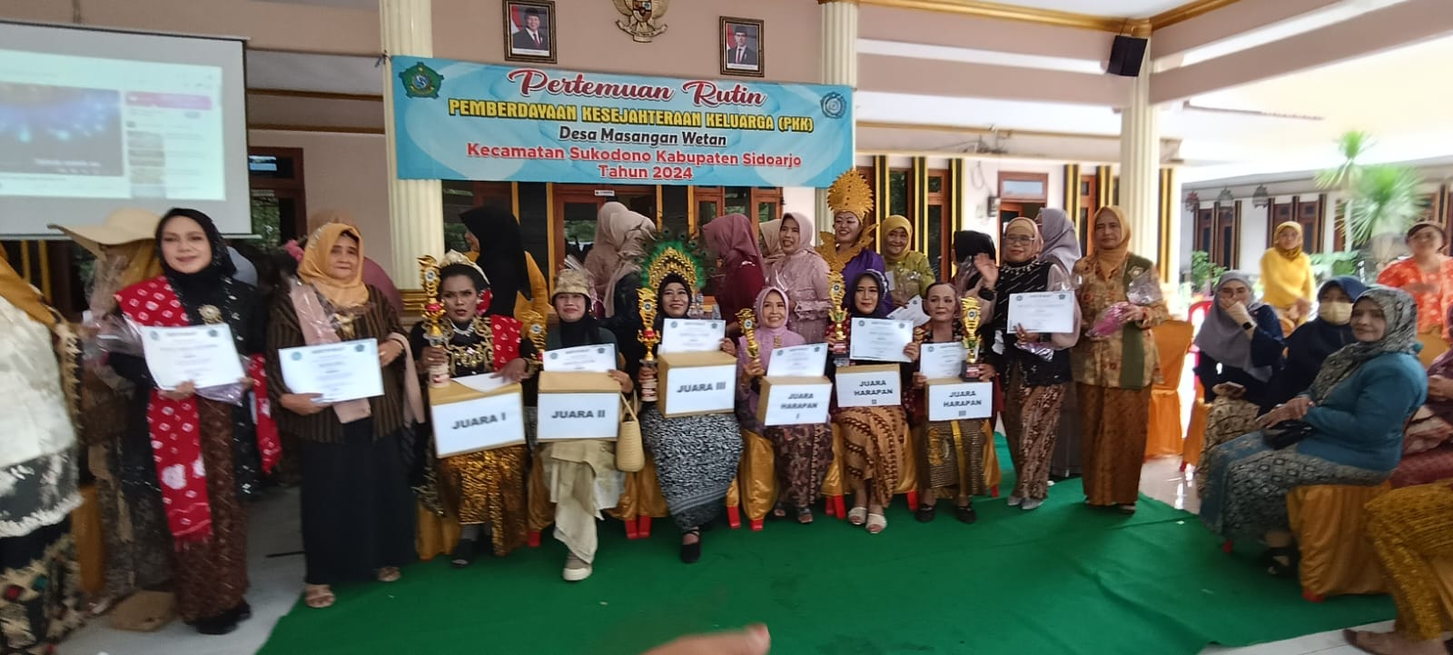 Disaksikan puluhan pasang mata para pengurus PKK se-Desa Masangan Wetan dan juga dewan juri, setiap lima peserta tampil di ‘cat walk’ dari hamparan karpet hijau di tengah pendopo. Banyak peserta diawal memasuki ‘cat walk’ terlihat canggung bingung menata kaki, ragu melangkah, gugup menyelaraskan kaki dengan sikap tangan saat berjalan.