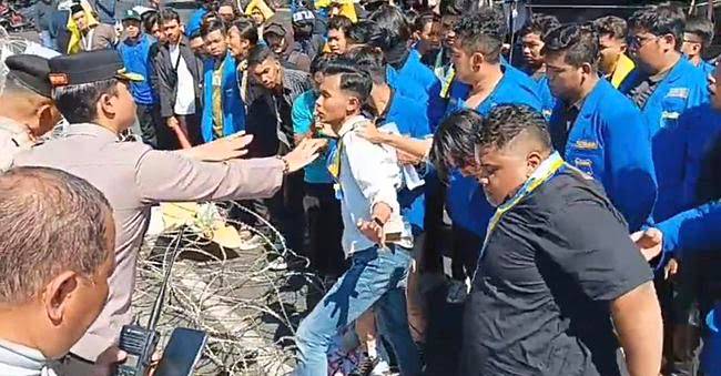 Massa yang tidak puas dengan hal tersebut, tetap memaksa untuk masuk dan memastikan langsung. Aksi Demontrasi saling dorong – dorongan pun terjadi. Beberapa mahasiswa yang nekat masuk dengan menginjak kawat berduri untuk akses masuk dihalau oleh aparat polisi.