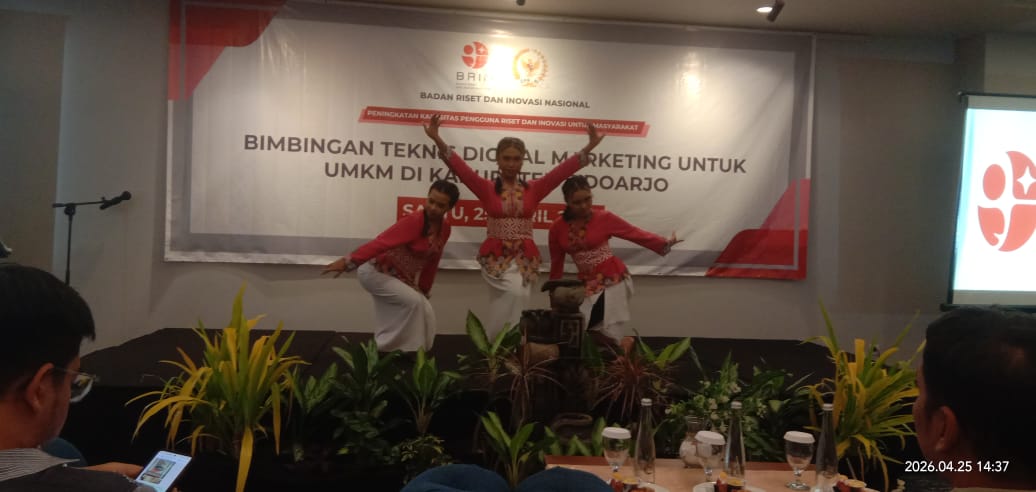 Acara Bimtek tentang Digital Marketing di Sidoarjo diikuti seratus pegiat UMKM dari berbagi jenis usaha. Dalam Bimtek itu, BRIN menghadirkan narasumber ahli muda, Raden Dwiarto, yang memaparkan strategi praktis digital marketing bagi pelaku UMKM. Acara dibuka dengan tarian “Puan Berdaya” dimainkan tiga penari muda yang kompak dan energik. (ton/red)