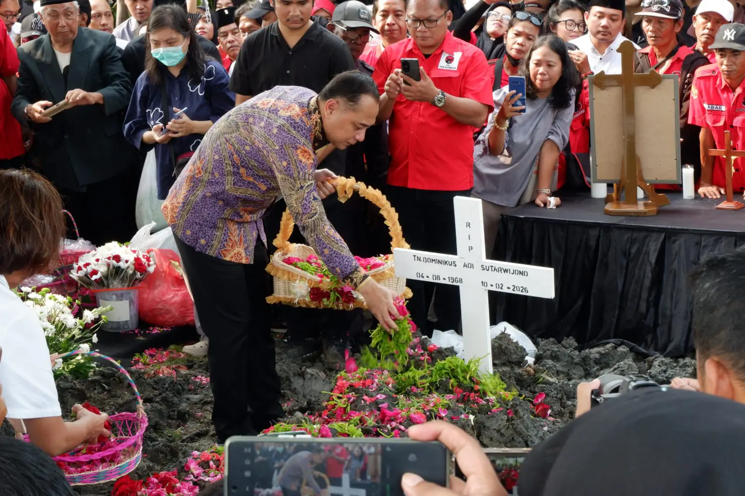 SR, Surabaya – Ratusan orang mengantarkan Dominikus Adi Sutarwijono Ketua DPRD Kota Surabaya ke peristirahatan terakhirnya, di Tempat Pemakaman Umum (TPU) Keputih, Kamis (12/2/2026) sore.