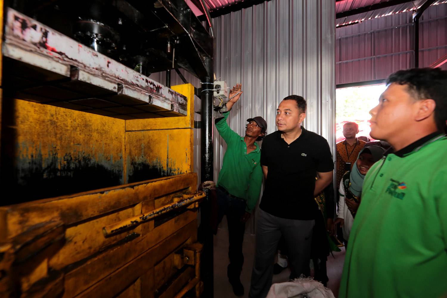 Pada kesempatan itu, Eri Cahyadi juga sempat meninjau ruangan-ruangan di Bank Sampah, termasuk melihat mesin pres botol bekas. Ia juga membantu memasukkan botol-botol itu ke mesin pres.