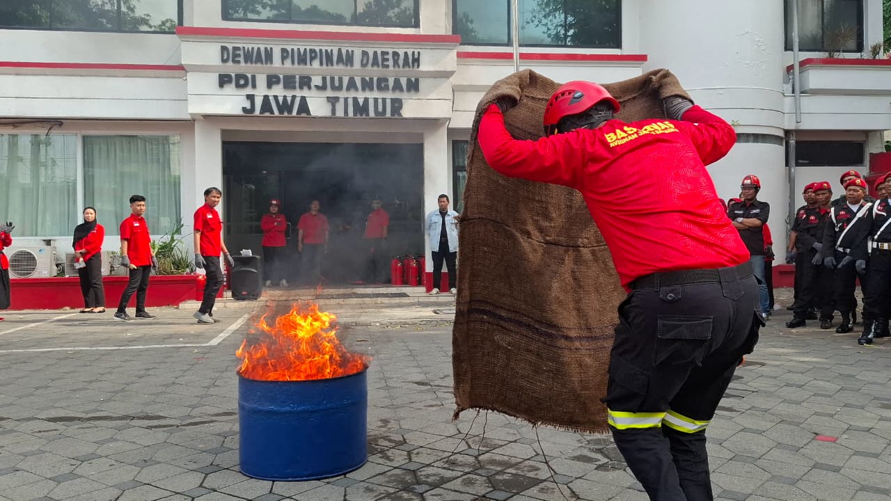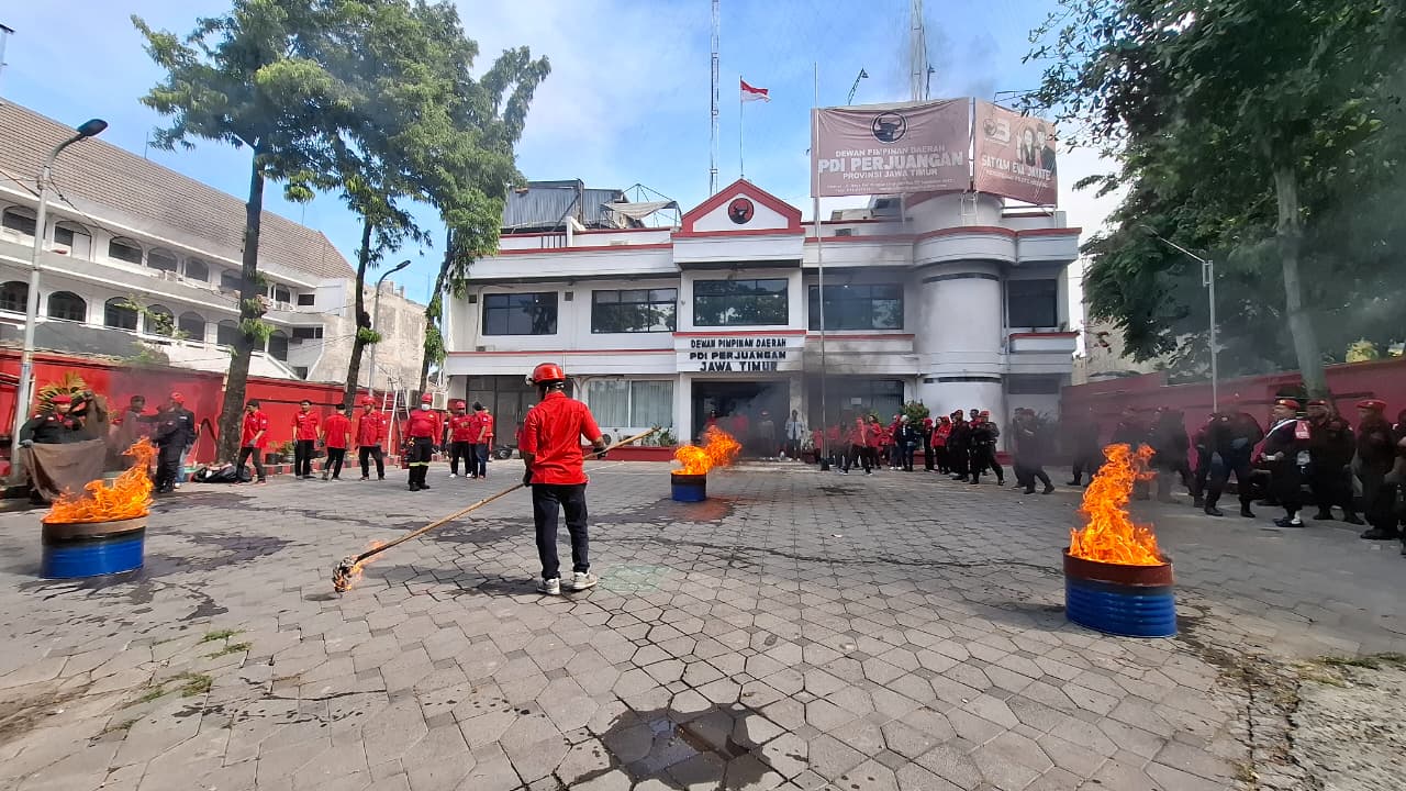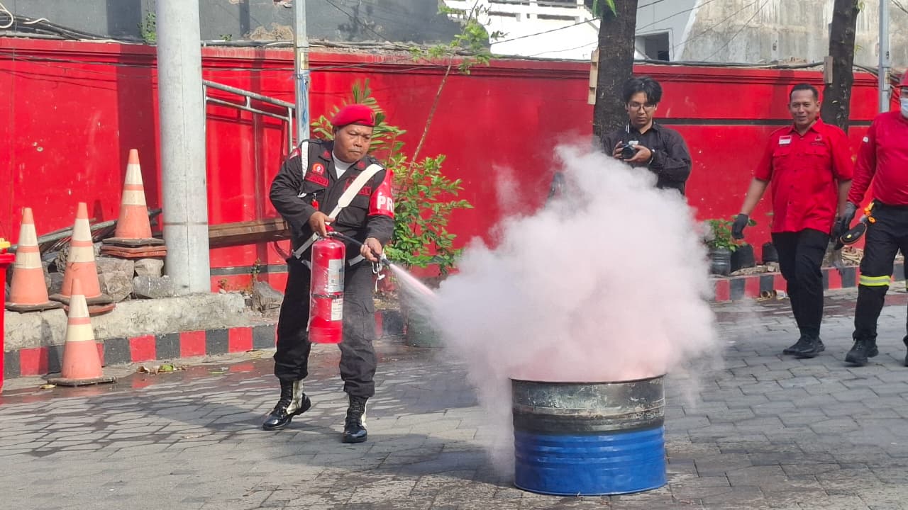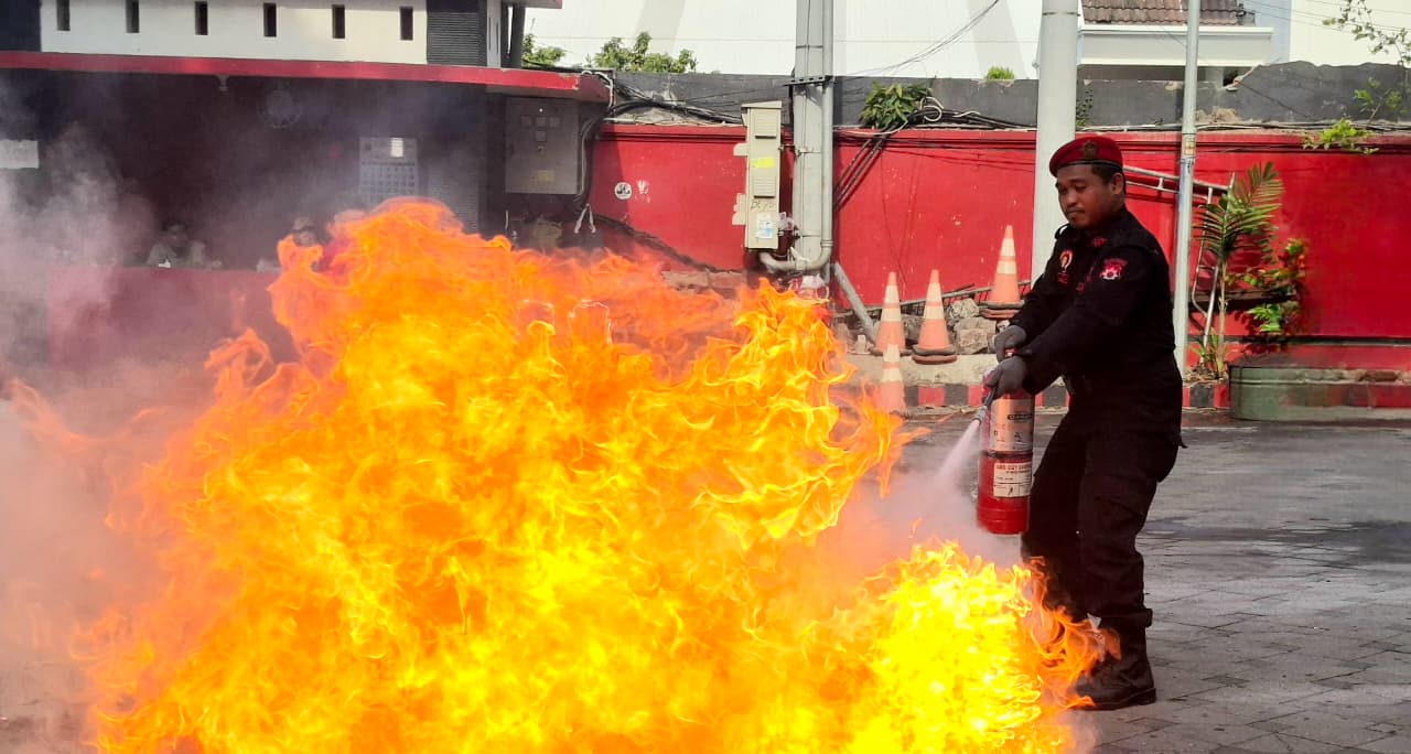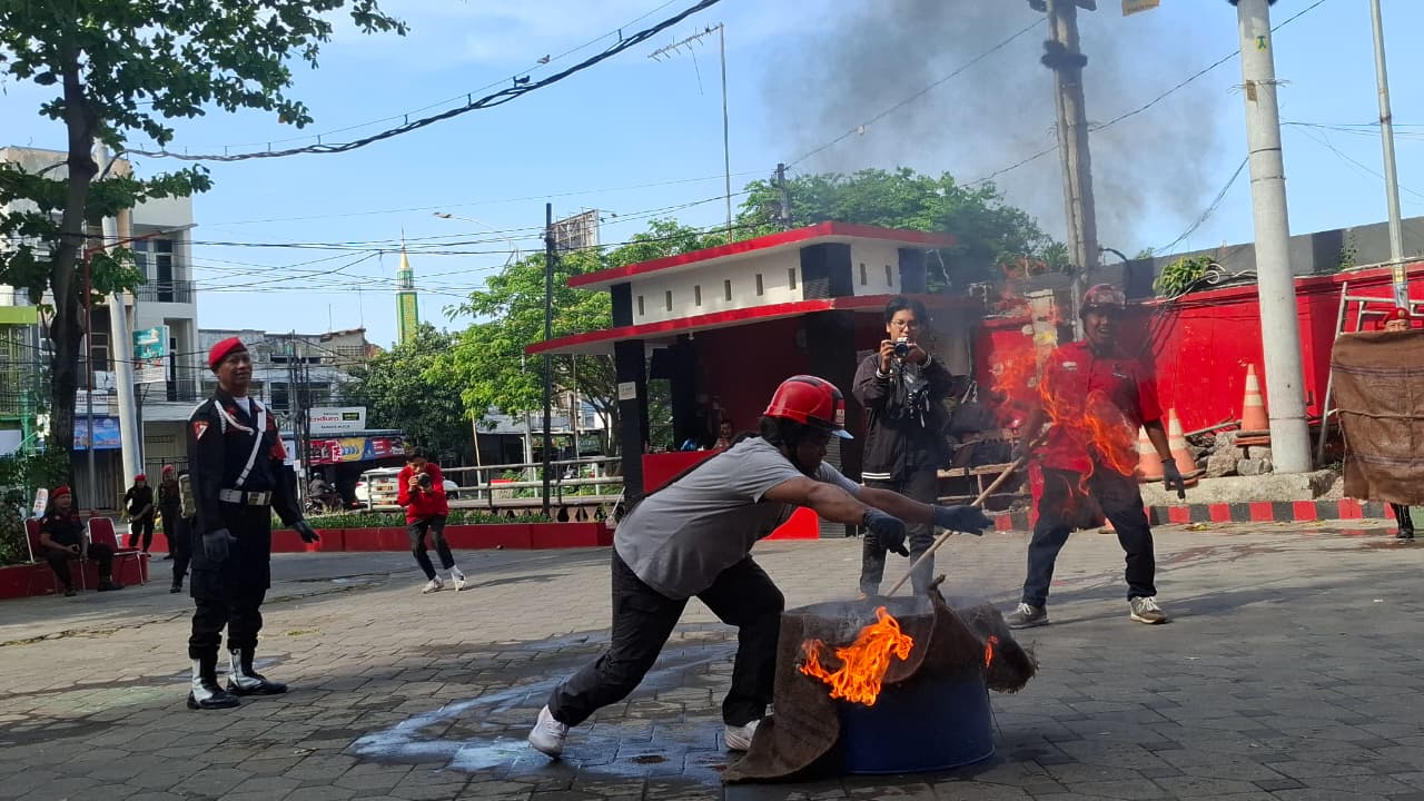 Salah seorang Satgas PDI Perjuangan praktek menggunakan APAR untuk memadamkan api dalam pelatihan simulasi pengamanan objek vital di Kantor DPD PDI Perjuangan Jatim, Minggu (7/9/2025). (foto: hamidiah kurnia/superradio.id)