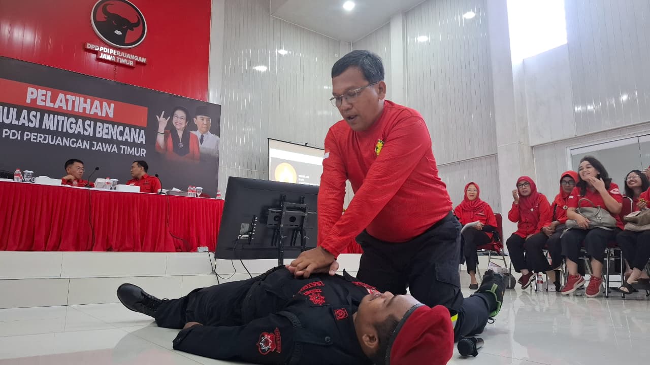 Instruktur Basarnas Surabaya Johan Saptadi saat memberikan materi Resusitasi Jantung Paru (RJP) pada pertolongan pertama saat terjadi henti jantung pada pelatihan simulasi pengamanan objek vital di Kantor DPD PDI Perjuangan Jatim, Minggu (7/9/2025). (foto: hamidiah kurnia/superradio.id)