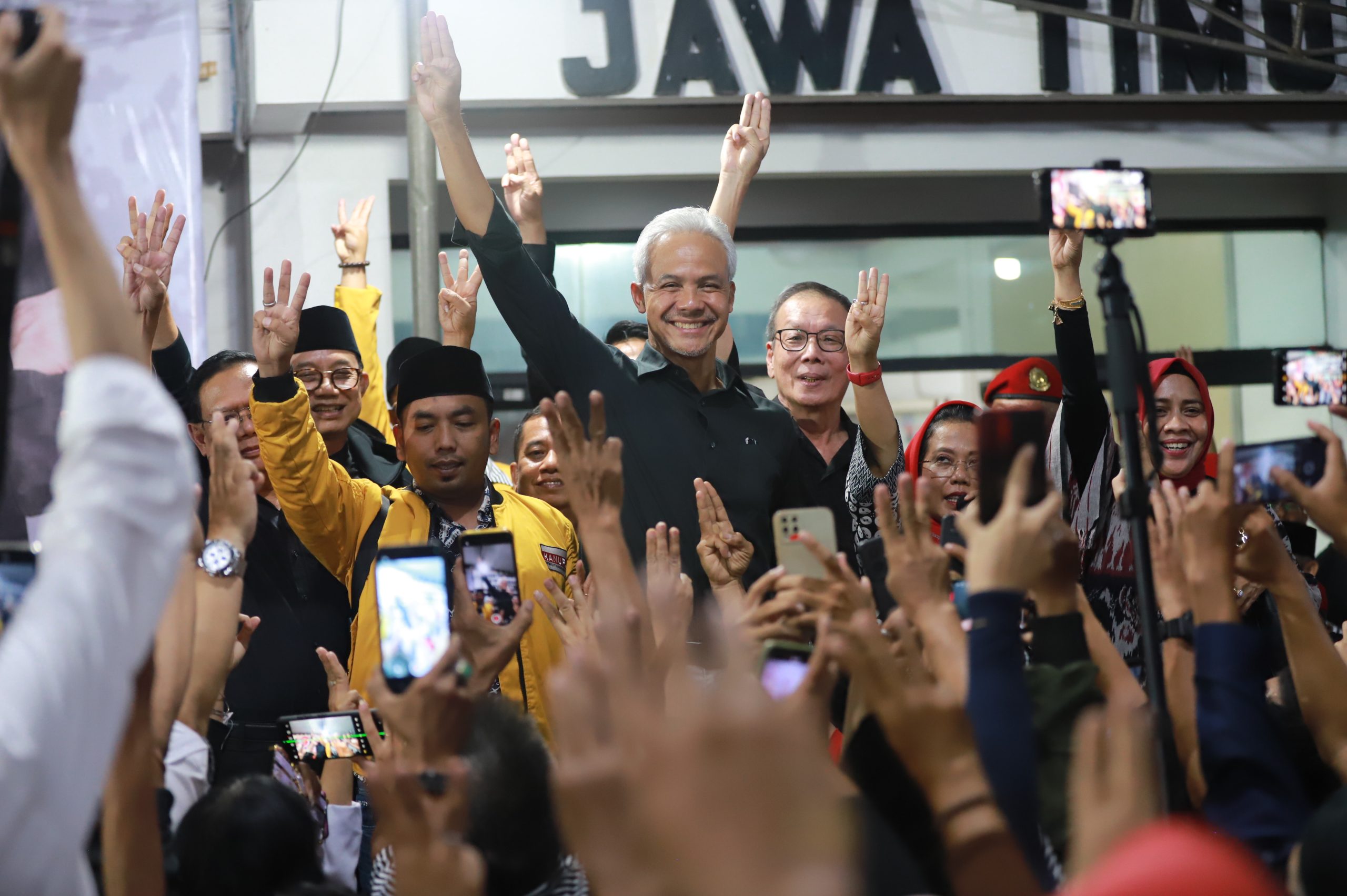 SR, Surabaya – Calon Presiden, Ganjar Pranowo menyapa sekaligus mengajak seluruh relawan Jatim untuk memperkuat perjuangan dan menghindari ujaran kebencian. Hal tersebut ia sampaikan saat menemui ratusan relawan di halaman kantor DPD PDI Perjuangan Jatim, Rabu (22/11/2023).