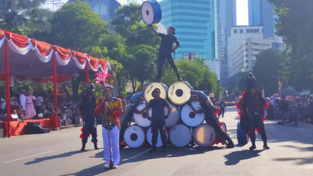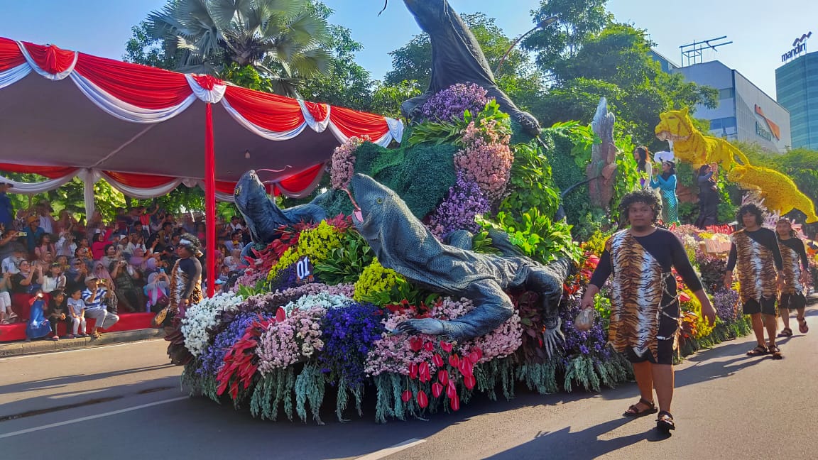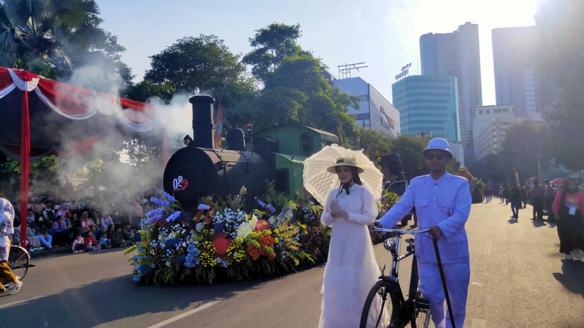 Diawali dengan marching band, perjalanan era Kora Pahlawan tergambar apik di parade bunga bertema The Chronicle of Surabaya itu.
