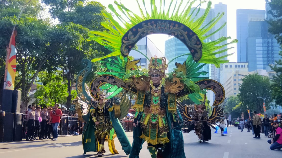 Ia yang datang bersama suami dan anaknya itu mengaku datang sejak jam 11.00 WIB demi menyaksikan parade. “Iya kesini memang dari pagi, tadi saja sudah macet, untung dapat tempat duduk di depan. Saya paling suka yang kostum kerajaan bagus sekali,” ujarnya.