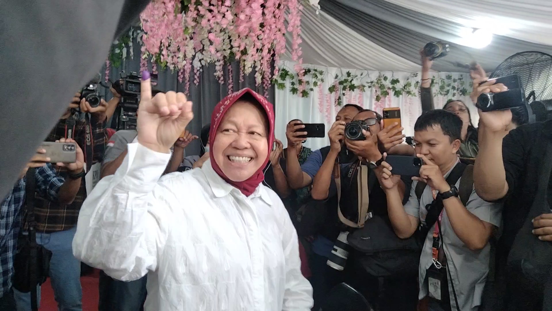 Risma, yang pernah menjabat sebagai Wali Kota Surabaya, tiba di TPS sekira pukul 07.15 WIB. TPS tempat ia mencoblos kini berjarak sekitar 300 meter dari rumahnya, setelah sebelumnya berada tepat di belakang kediamannya.