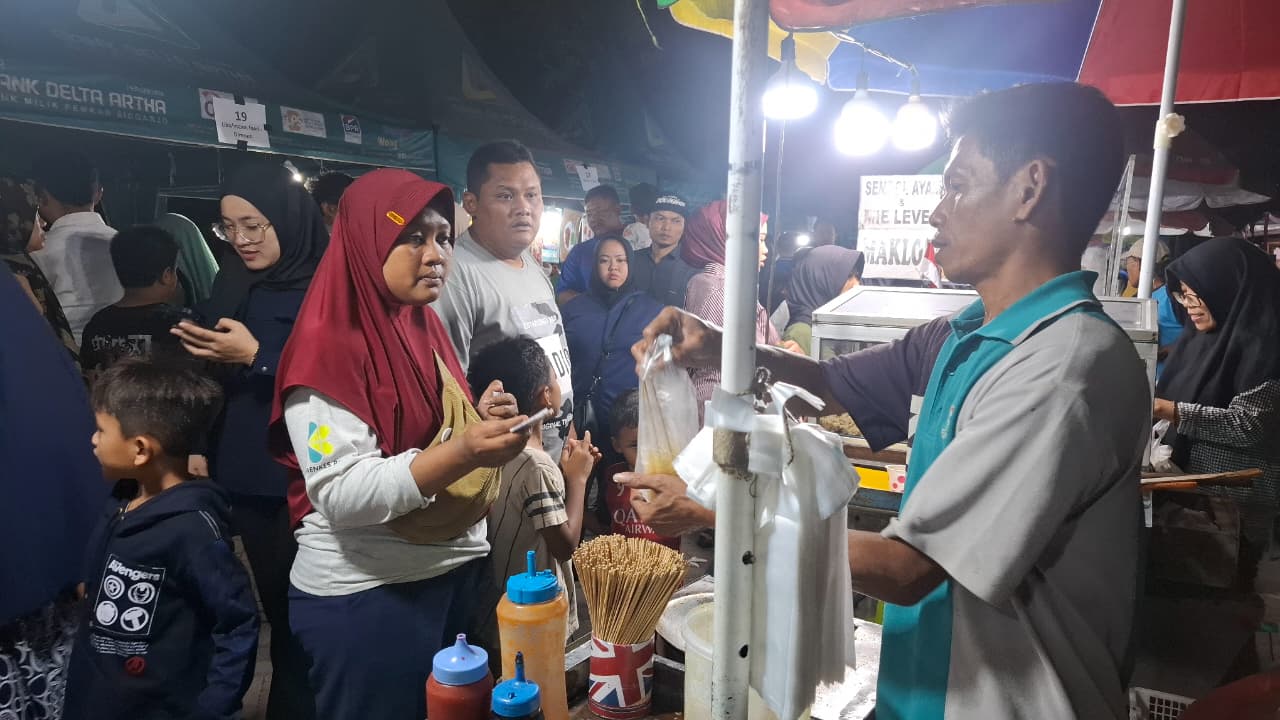 Tampak area bazar dipenuhi sekira 76 stan UMKM setempat yang ramai pembeli sejak sore, Rabu (10/9/2025). Salah satunya Madil (40) warga Buduran yang membuka stan telur gulung. Ia mengaku khusus acara besar bisa menghabiskan hingga 7 kilogram telur dengan omset mencapai 500ribu sehari.